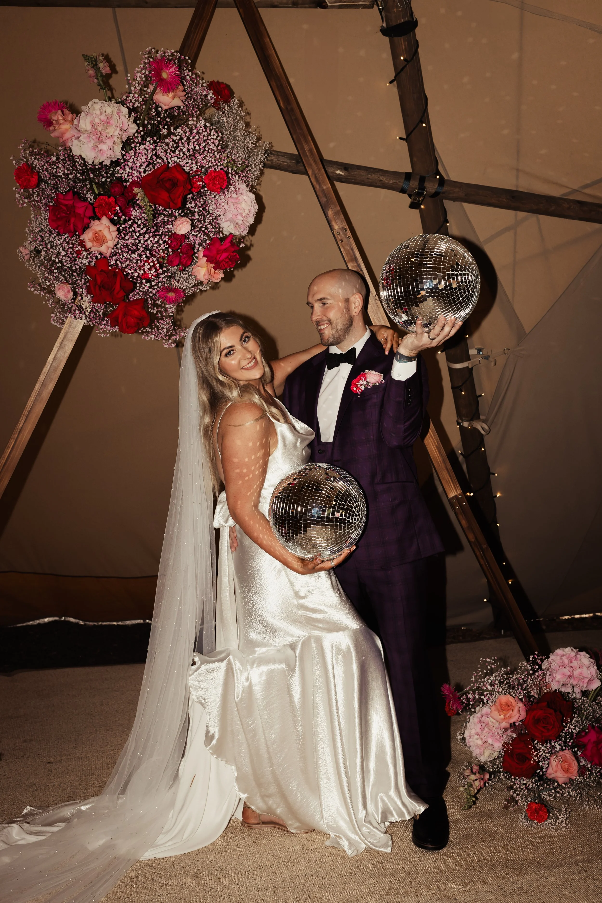 With lots of pink flowers, huge hydrangeas, reflexed roses and bright red anthuriums popping off everywhere, the flower vibes were immaculate! Lining the isle with meadows, ending the isle with a wooden A frame full of flowers to compliment the surroundings but also bringing the fun vegas vibes to the woodland. Bud vases lined the tables and crates were full of flowers and disco balls leading into the tipi.